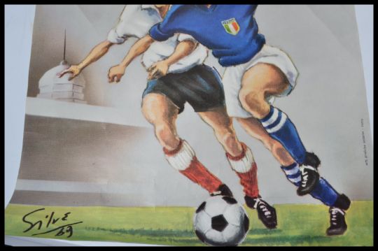 Football Poster: A rare vintage 1969 ' Under 21 In England ' colour football poster. Designed by artist Silve. Depicts two footballers, with notation to top. Rolled, no tears. Generally good condition. Rare poster. Measures approx; 68cm x 48cm.