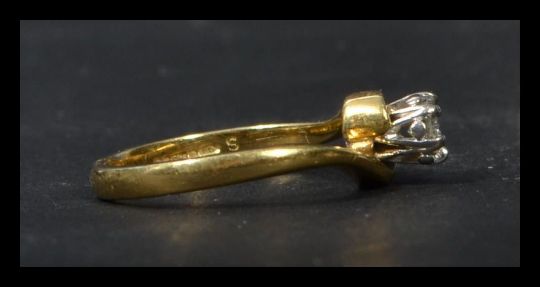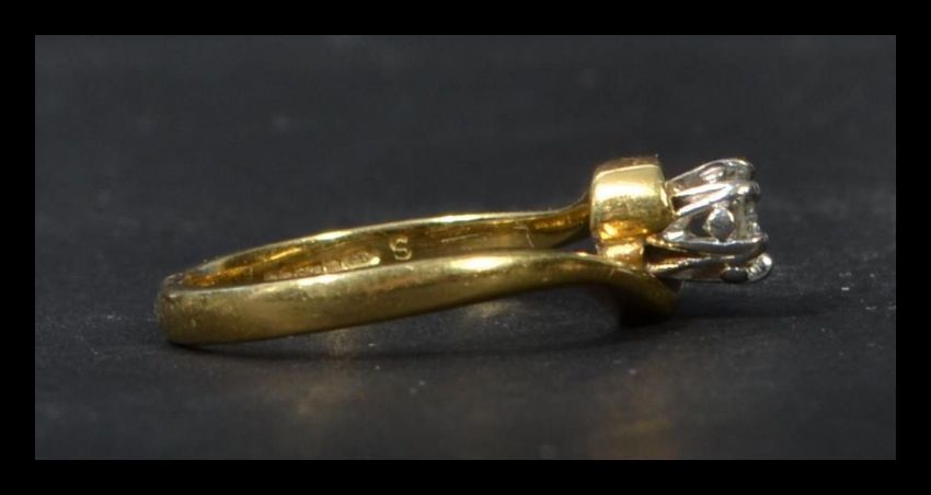 A hallmarked 18ct gold and diamond solitaire ring set with a single round cut diamond of approximately 10pts. Size K. Weight 3.3g.