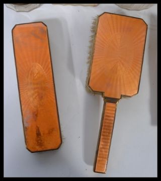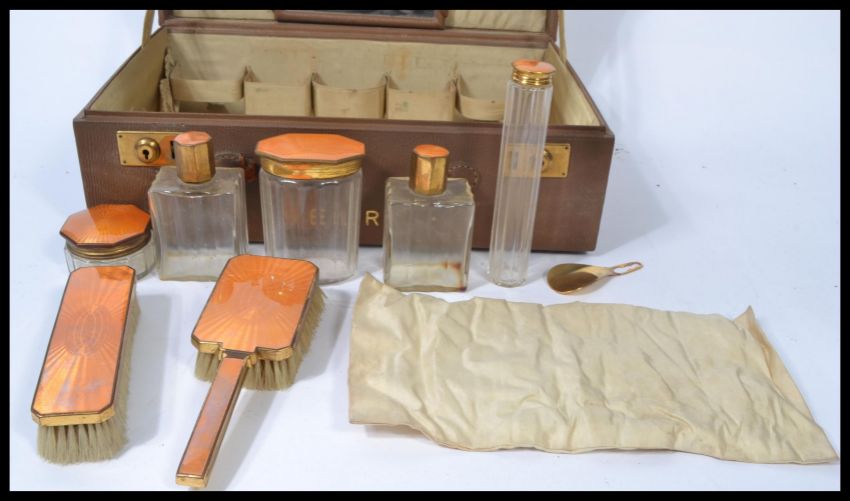An early 20th century Art Deco enamel vanity set in original case having faceted glass pots , brushes , mirror etc. Measures 13 cm high, 40 cm wide and 27.5 cm deep.