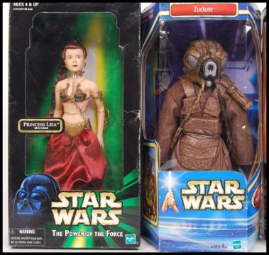 Three Hasbro made Star Wars action figures to include; The Power of the Force ' Princess Leia ' , Episode I ' Watto ' & The Empire Strikes Back ' Zuckuss '. All within their original boxes.