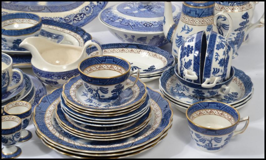 A good collection of vintage blue and white Staffordshire ceramics in the Willow pattern, dating from the late 19th century and all stamped to the base for Booths.