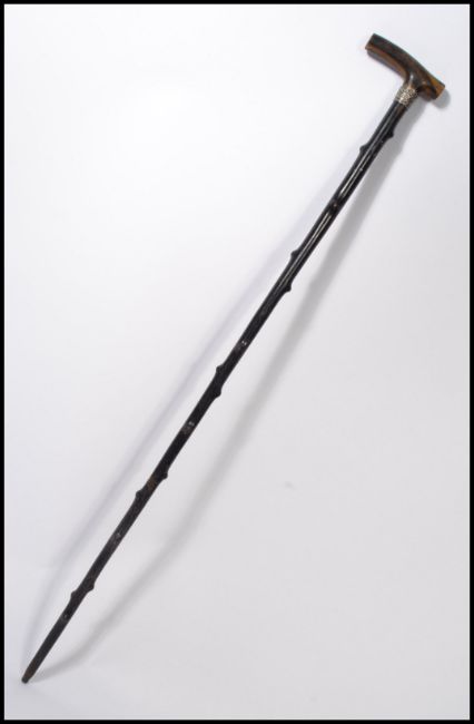 A silver hallmarked scroll work collared horn handled walking cane on blackthorn shaft