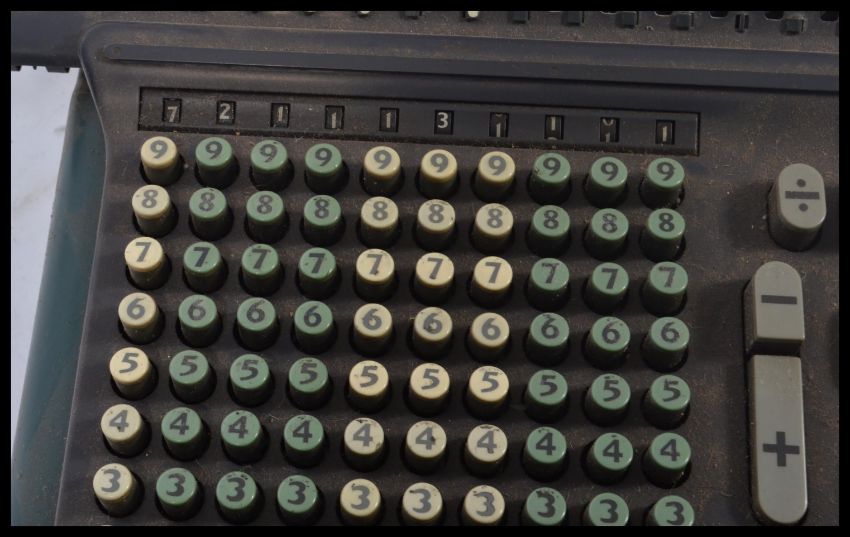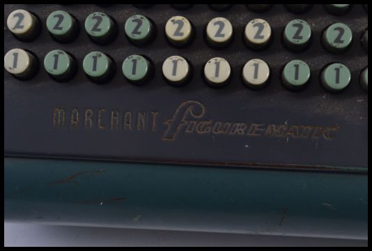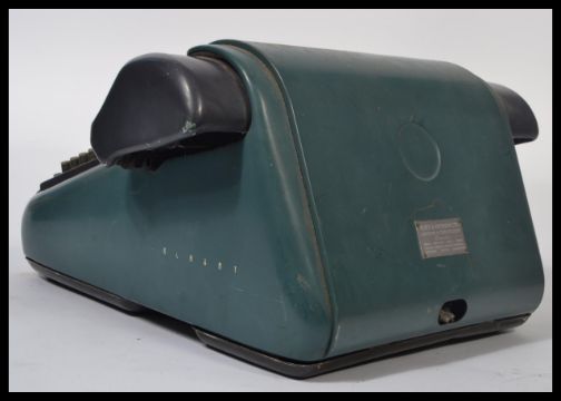 2 vintage mid century retro typewriters, one by Adler, the other by Underwood together with an early 20th large office calculator. Calculator measures 24 cm high, 41 cm wide and 41 cm deep.
