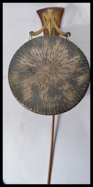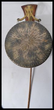 A vintage early 20th century wall mounted gong of brass construction on a wooden mount complete with strike. Measures 42 cm high and 26 cm diameter.