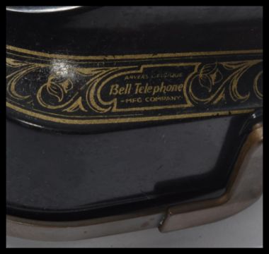 An early 20th century FTR Belgian black telephone handset having good shape with central finger ring dialler and receiver atop. Measures 26 cm wide.