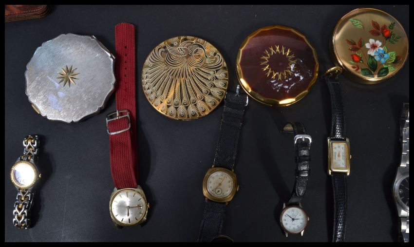A collection of vintage costume jewellery to include Stratton compact and others , watches , rhinestone , Japanese hair pin , filigree , etc. Please see images. Measures 7 cm diameter.