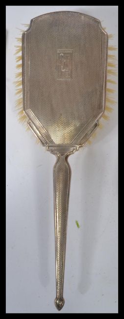 A silver hallmarked dressing table set complete in the original box comprising mirrors and brushes ( comb af ) Hallmarked for Charles S Green & Co, Birmingham 1953. Longest measures 29 cm.