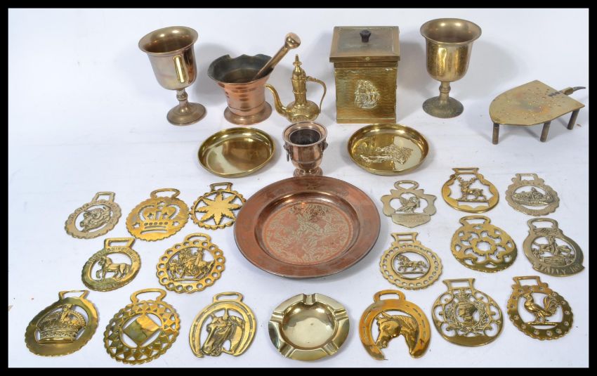 A group of vintage metal ware to include a pair of 18th century bronze ecclesiastical chalices , a bronze pestle and mortar , copper plate , horse brasses etc. Please see images. Measures 15 cm high.
