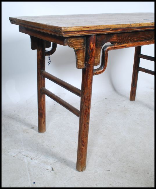 A 20th century large Chinese alter / side table from the Shanxi province having a rectangular top with carved frieze raised on squared legs and stretchers.