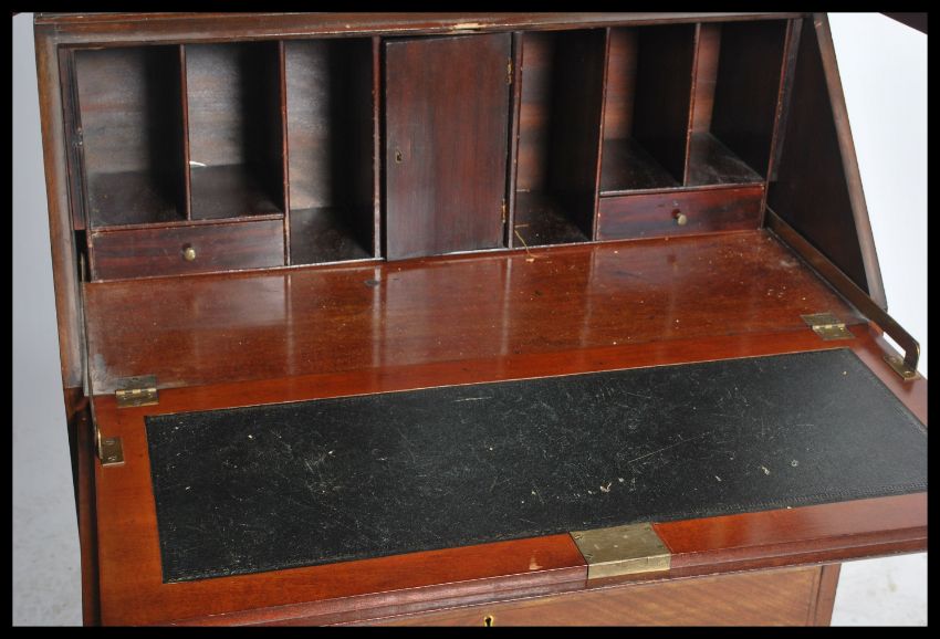 A vintage 20th century mahogany inlaid bureau bookcase, astragal glazed upper section over a fall front enclosing a pigeon hole interior, four long drawers to the base raised on cabriole legs. Measures 199cm x 75cm x 45cm.