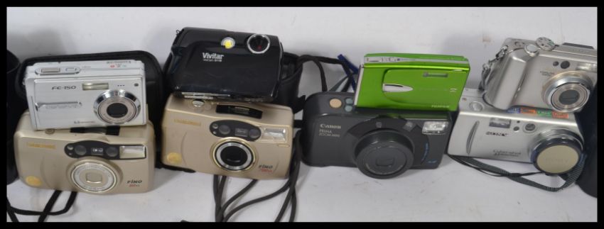 A collectiuon of vintage cameras to include a Sony Cyber Shot , Fujifilm Zoomdate 160s , Olympus Camedia C310 Zoo , Vivitar Vivicam 5119 and 3786s , a Olympus Fe150 , Fujifilm Fine Pix Z a Nikon Coolpix 5200 Ybersonycam Ysc3000 , Samsung Fino 80xl , Minolta Riva Zoom 135ex , Samsung Fino 700xl , OLympus mju-1 etc. Some with camera bags please see images.