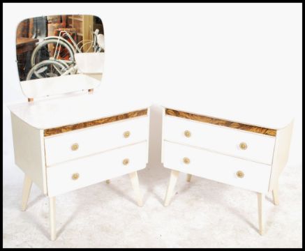A mid century retro dressing table and chest of drawers combination. Each with original painted finish, both raised on tapering legs with banks of drawers, the dressing table with shaped mirror atop. Measures: 114cm high x 72cm wide x 46cm deep.