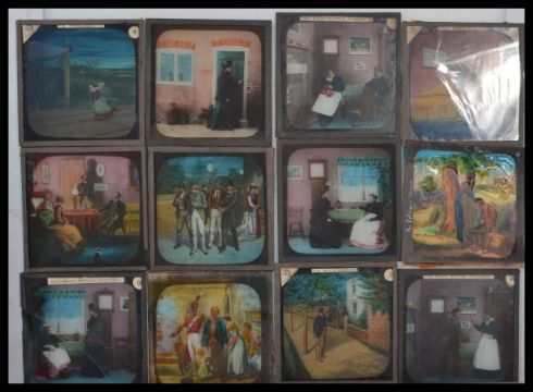 A vintage wooden magic lantern slide case full with vintage magic lantern slides, including mostly hand coloured slides of nursery rhymes , scenes and people. Please see images.