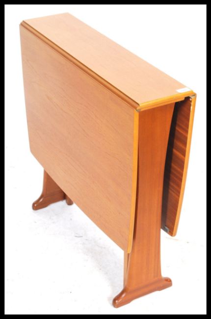 A retro 20th century G-Plan style teak drop leaf dining table having shaped supports, the end leaves rising on gate legs.Measures: 54cm high x 103cm long.