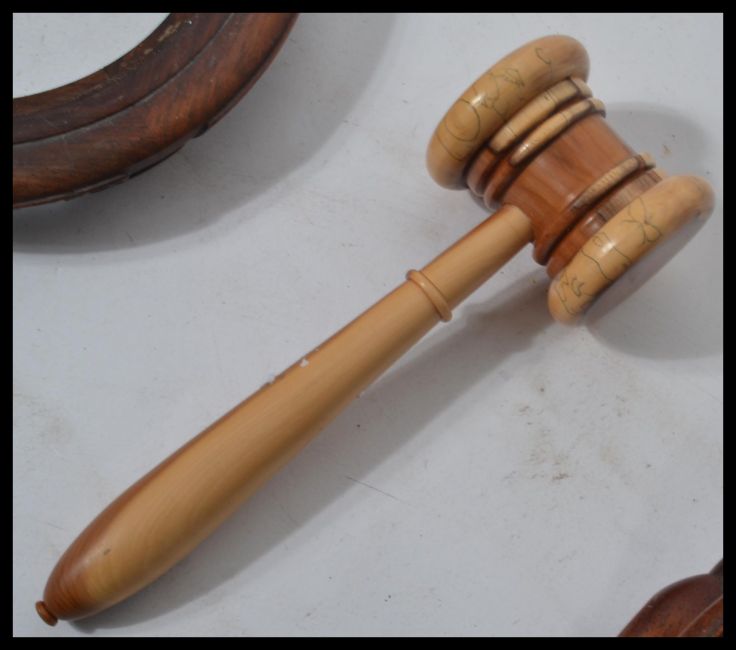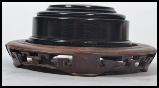 A pair of non matching vintage early 20th century Chinese hard wood carved socle bases together with a stunning turned gavel and base. Measures 20 cm long and 19 cm diameter.