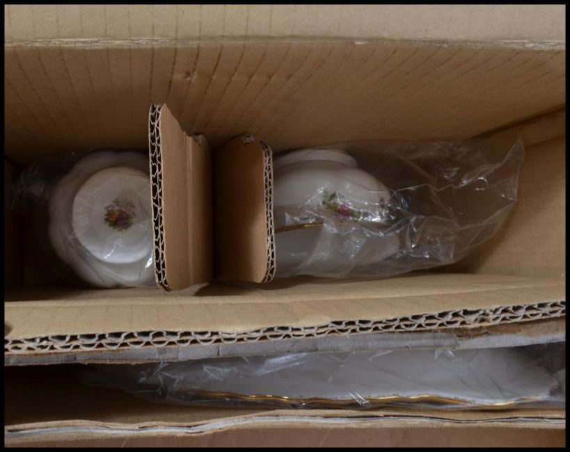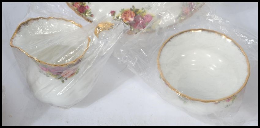A twenty - one piece bone China tea service by Royal Albert in the Country Roses pattern, retaining original box and packaging appearing to be unused.