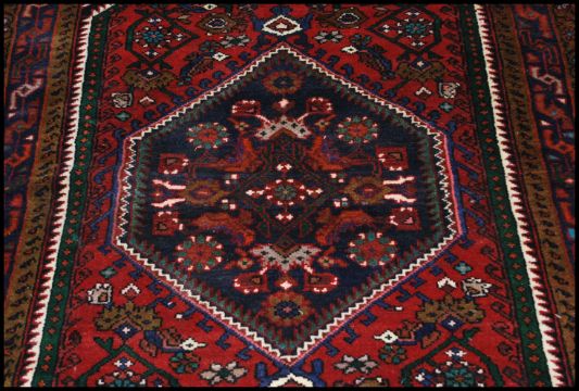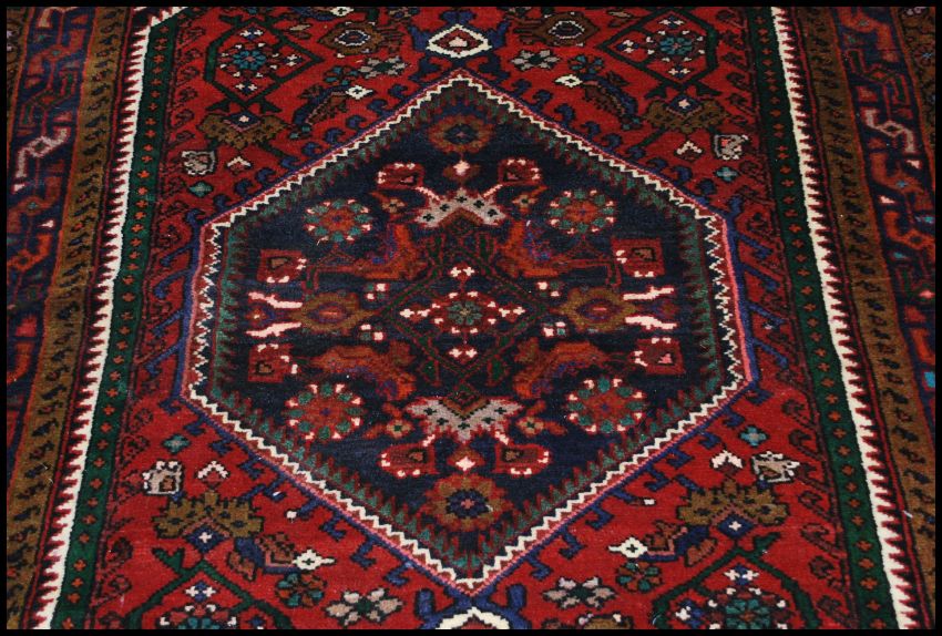 A 20th century Heriz Persian rug with central twin lozenge fielded centre on red ground with stunning spandrels and decorative borders having tassled ends. Measures 202cms x 127cms