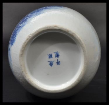 A 19th century blue and white Chinese vase having a tapered neck and rim with hand painted scenes of men playing a betting game Pachinko in a boat with a lady rowing and figures seated to the front. Exotic ho ho bird with moon and trees over head with mountain. Four blue character Kangxi marks to base. Measures 32 cm high.