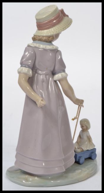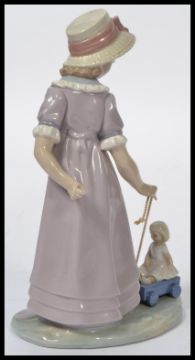 Lladro - A Lladro figurine entitled "Girl with Calf" # 01004813, marked to the base "Lladro hand made in Spain" approximately 20 cm (h) along with a Lladro figure of a gilr pulling a doll in a cart.