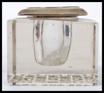 An early 20th century Mappin and Webb silver hallmarked topped inkwell and pen rest having a cut glass body of cube form. Hallmarked for Birmingham 1908. Measures 7 cm high, 7.5 cm wide and 7.5 cm deep.