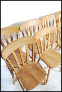A set of 8 antique style beech wood Windsor style dining chairs. Raised on turned legs united by stretchers having saddle seats, lathe back rests and shaped top rails. Measures: 89cm high x 50cm wide x 50cm deep.