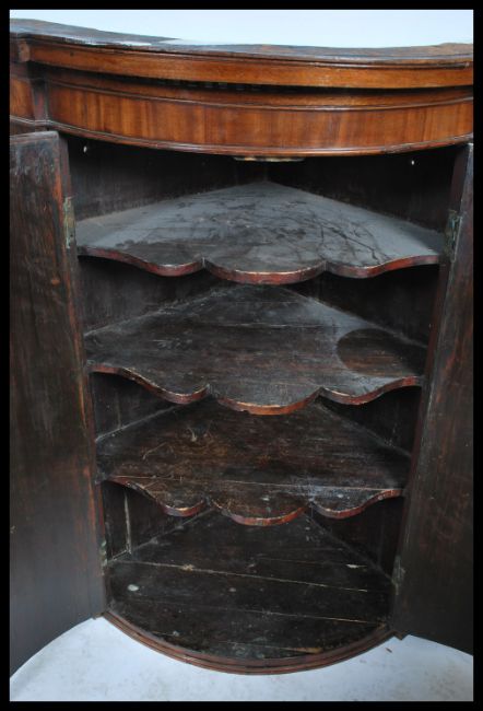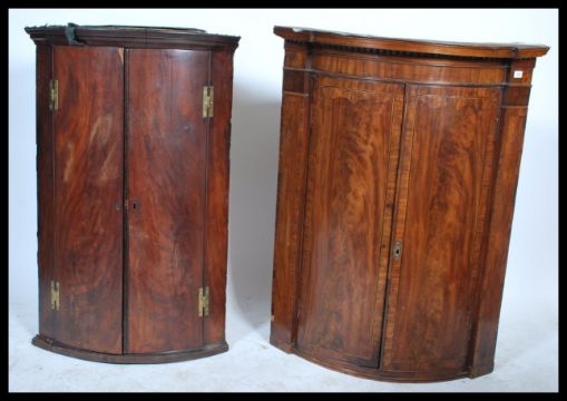2 19th century Georgian flame mahogany bow fronted corner cabinets. One larger with inlaid marquetry detailing, each with full length panel doors with shelved interiors. Measures: 112cm high x 88cm wide  and  11cm high x 71cm wide.