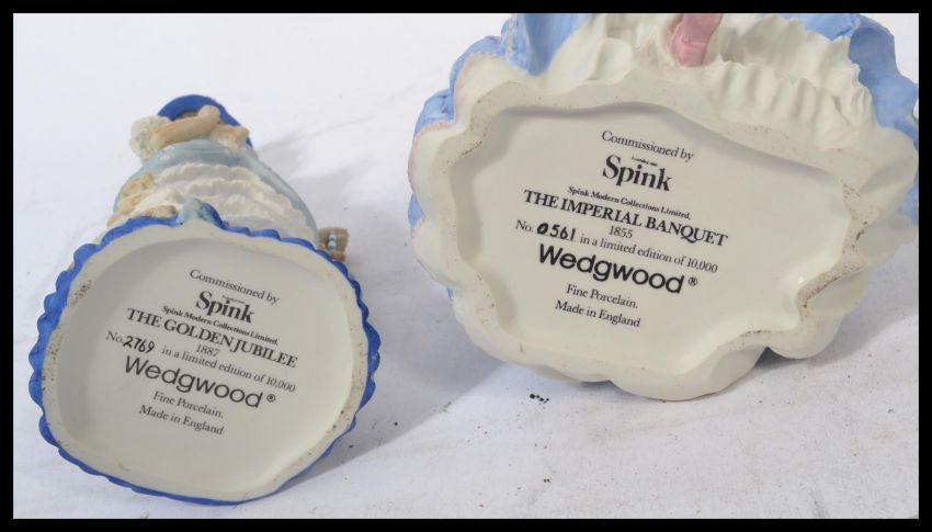 Two Wedgwood Spink commissioned ceramic figurines with certificates , The Imperial Banquet 1885 0561 / 10000 and The Golden Jubilee 2769/10000. Measures 22 cm high.