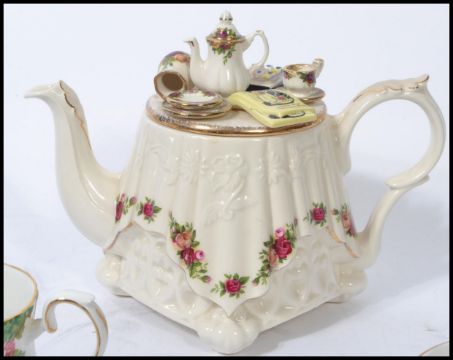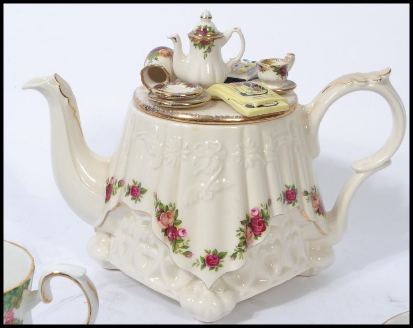A 20th century novelty bone China Royal Albert Country Roses teapot together with a bone China tea service in a similar pattern by Royal Stafford.