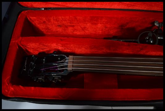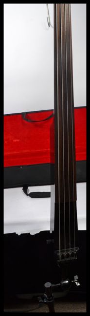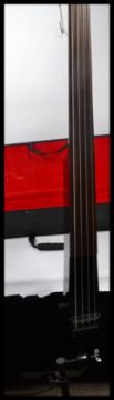 Dean Upright Bass Guitar; a superb Dean made upright ' Wedge ' style fretless electric bass guitar. Supplied within the original case, complete with stand. Dean makers label headstock, rosewood fretboard and a black lacquered finish. Measures 113 cm high. IMPORTANT NOTE: OPEN TO UK BIDDERS ONLY This guitar will be subject to CITES regulations when exported out of the UK as it contains Rosewood.