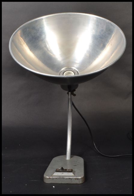 A fantastic mid 20th century desk lamp raised on a cast metal base with a sweeping polished steel arm surmounted with an oversized polished steel conical shade.