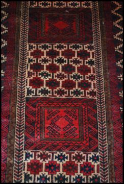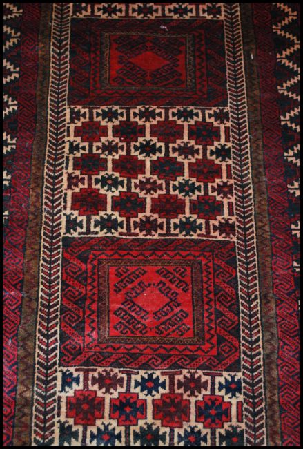 An Oriental Qashqai style wollen rug having red ground with central design of 5 panels,  geometric borders  and wavey edges . Measures 180cms x 97cms