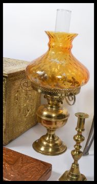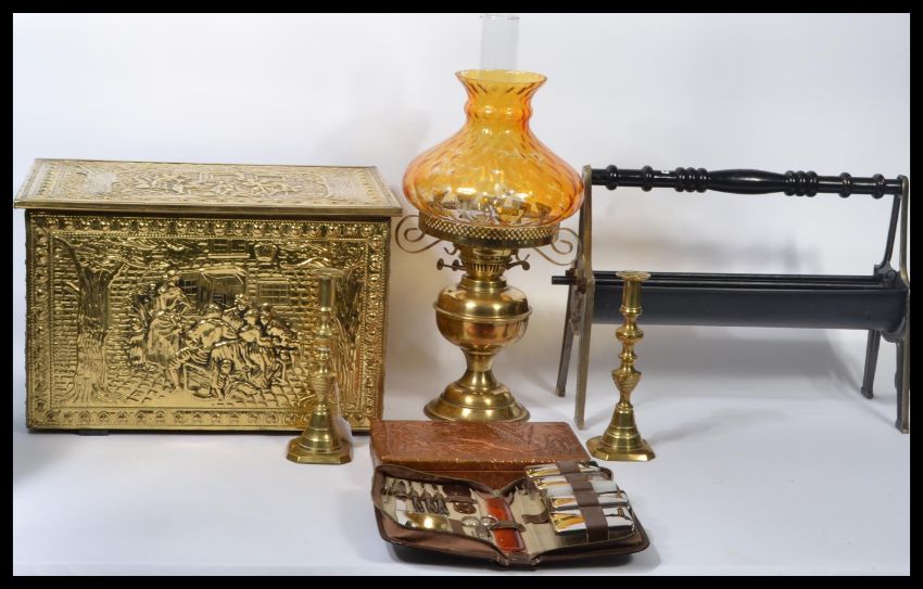 A collection of vintage items to include a pair of 19th century Georgian pusher candlesticks , a Dutch master scene brass box , a small copper duck scene box , a vintage brass oil lamp with orange glass shade , a paper roller etc. Highest measures 53 cm.