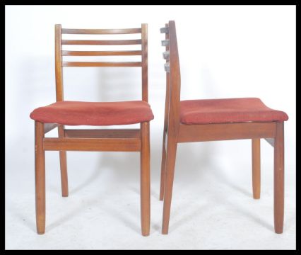 A set of mid century dining chairs being of Danish influence having shaped legs with upper peripheral stretchers and overstuffed seats and back rests. Measures: 72cm high x 151cm long x 75cm deep.