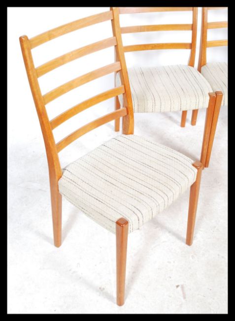 A good set of retro 1960's teak wood dining chairs by Svegards Markaryd being raised on turned and tapering supports with overstuffed seats having shaped rail back rests to the rear. Stamped to the underside. Measures: 96cm high x 45cm wide x 43cm deep.