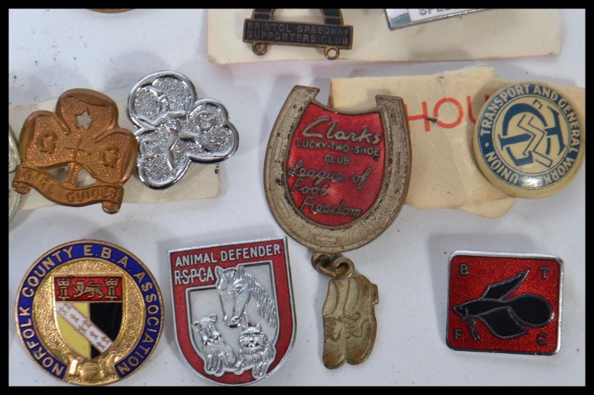 A good collection of vintage Enamel pin badges dating from the first half of the 20th century to include Bristol Speedway Supporters Club, Smith's Twist and Double Twist, National EBA Championships, Clarks Lucky Two Shoes Club, Cyclists Touring club, Girl Guides, Scouts, Bowling clubs, a silver hallmarked USDAW and many many more please refer to images. Highest measures 3 cm.