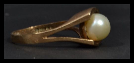 A 9ct gold pearl ring being hallmarked. The central large pearl on suspension setting. Total weight 4.3g complete in the presentation case