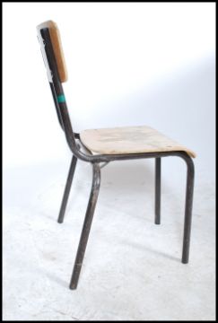 A stack of four vintage mid 20th century industrial tubular grey metal framed stacking chairs with ply seats and back rests