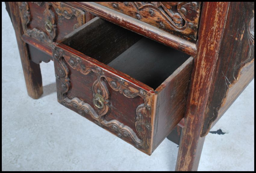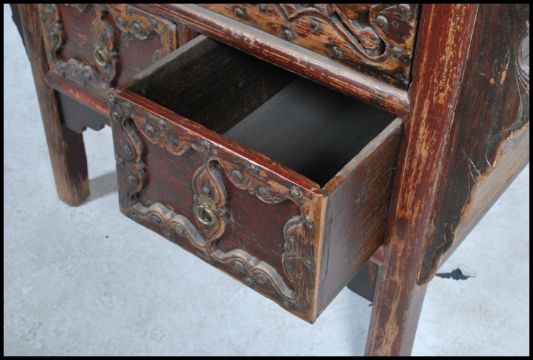 A believed late Qing dynasty / early Republic of China antique Chinese elm wood altar table chest from the Shanxi province, the chest being of large square form having an alter top with a single wide and deep over two drawer composition. Each drawer has a heavily relief carved front having brass plates and loop handles, the table itself having many carved spandrels and raised on squared legs all finished in a reddened lacquer.