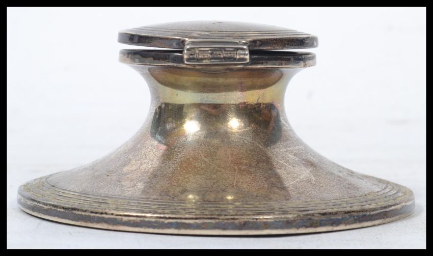 A silver hallmarked Capstan inkwell by Walker & Hall with sheffield hallmarks, date letter illegible. Measures 5.5 cm high and 10.5 cm diameter.