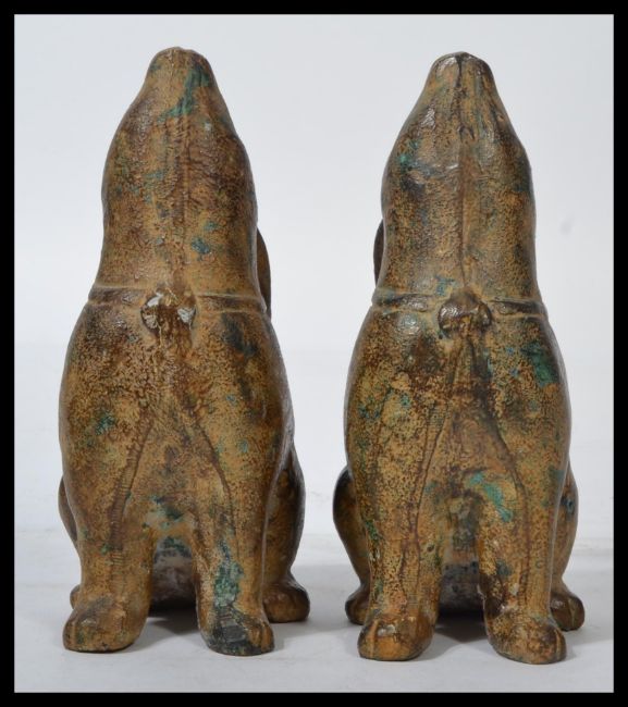A pair of cast bronze figurines modelled as rabbits looking skywards whilst sat on their hind legs. it is 22cm in height