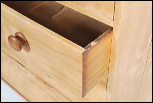 A Victorian satin walnut chest of drawers being raised on bun feet with 2 short drawers over 3 deep drawers, all with knob handles. Measures 102cms by 45cms by 51cms.