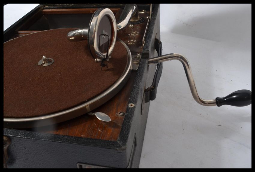A 1930's HMV picnic portable gramaphone model no 101 having fully appointed interior with swivel key pouch complete with the key. Measures 42 cm deep.