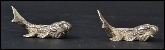 A pair of silver hallmarked continental paperweights in the form of fish, possibly Bream. Both marked to the underside. Total weight 80g, Measures 5 cm.