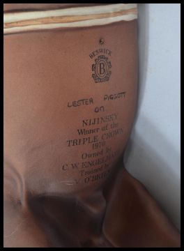 A Beswick model from the connoisseur series, "Nijinsky" with Lester Piggot UpThe jockey in shades of green and yellow on a numnah numbered 3 raised on a oval hardwood plinth. Condition report. The rubber reins have snapped and there are minor scratches to the piece but overall in good order. Measures 33cms high.