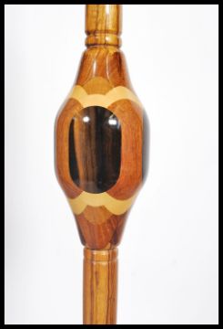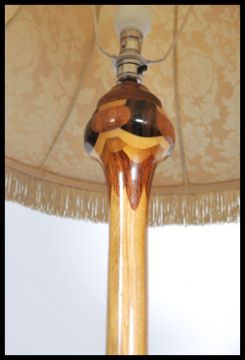 A stunning 20th century craftsman's sample wood standard lamp being made from many woods to include sapele wood, maple and many others. The lamp in working order with shade