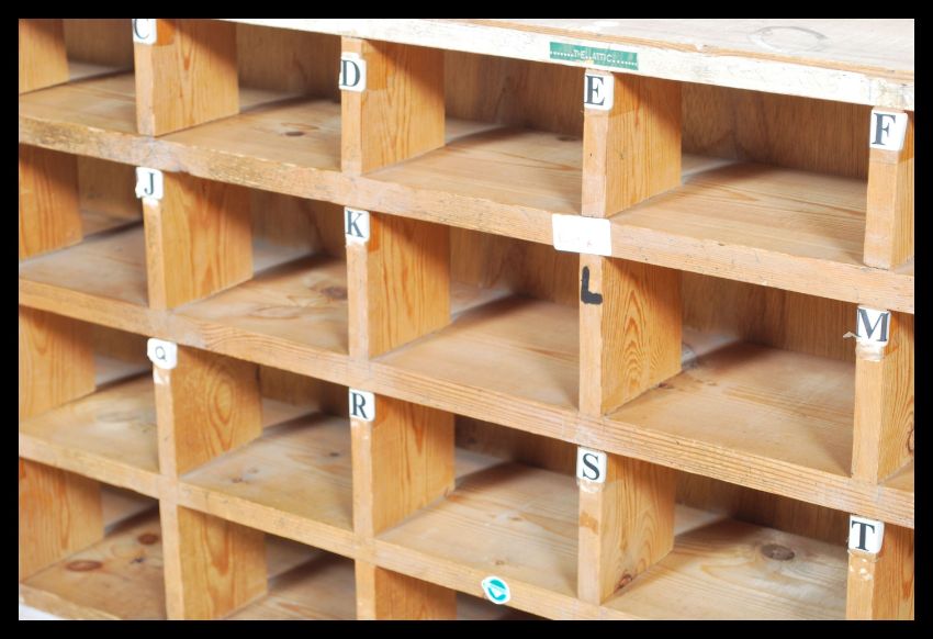 A vintage mid 20th century scratch built pine wall hanging pigeon hole. Measures 54cm x 123cm x 17cm.