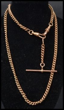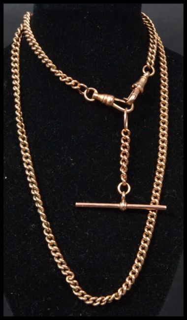A hallmarked 9ct gold heavy double strand Albert chain having a T bar. Weighs 19.7 grams. Measures 53 cm long.