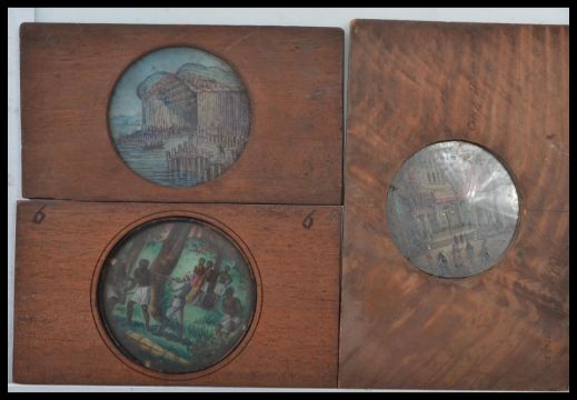 A collection of 19th century Victorian hand coloured glass plat magic lantern slides in wooden frames depicting various scenes , buildings , people etc. Please see images.