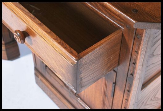 Ercol - Mural -  An unusual elm upright cupboard having a wide top and bookcase above with angled sides to create a modular unit with similar cabinets in this pattern along with an upright corner cabinet (please refer to images). Finished in a standard golden dawn colour. Measures  197cm x 90cm x 48cm.