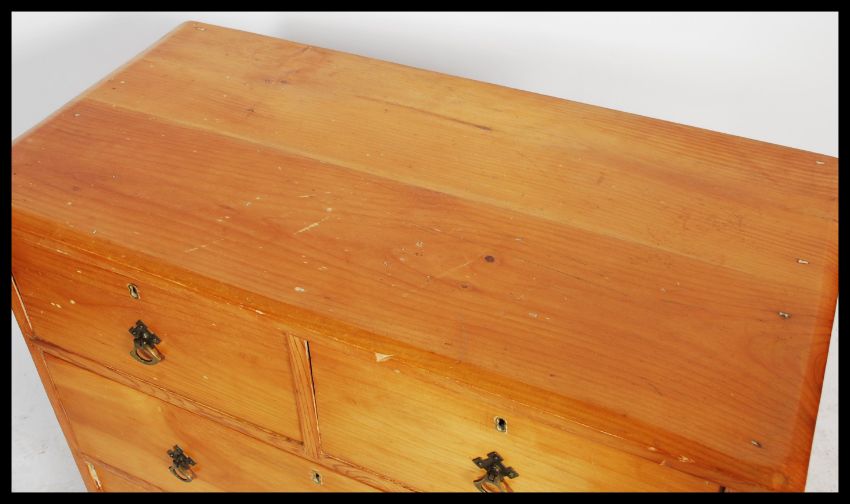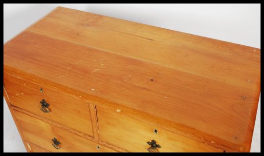 A Victorian Arts & Crafts pine cottage chest of drawers having 2 short over 2 deep drawer configuration. Good brass architectural handles to each. Finished with plinth base and flared top. Measures 84cm x 90cm x 46cm.